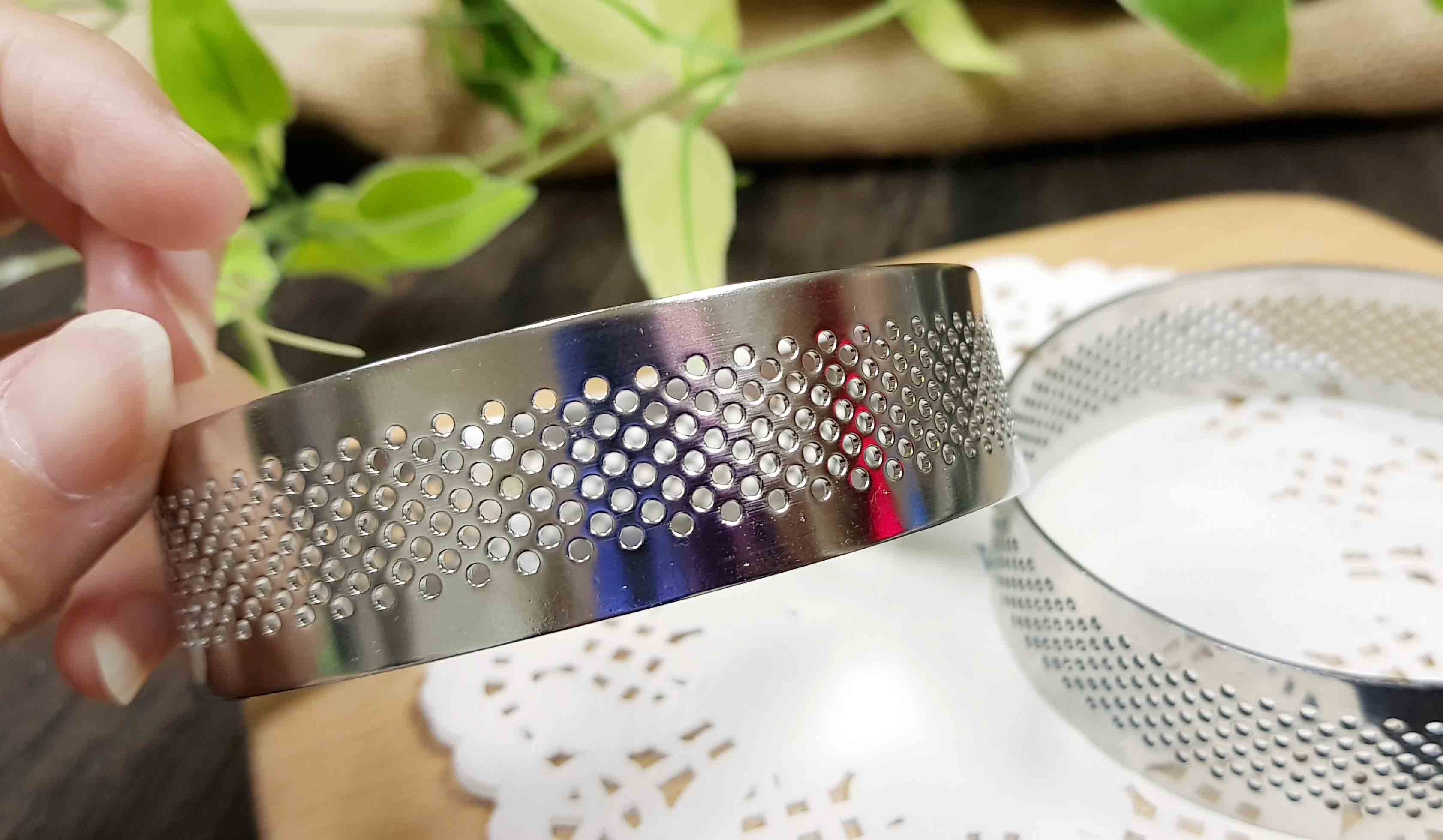 採用 #304 不鏽鋼電解處理,耐高溫、耐腐蝕、堅固耐用、不易變形且永不生鏽。設計專為製作塔皮甜點,透氣孔均勻分布,使熱量傳導更均勻,烘焙出的塔皮定型完整,不易塌陷。